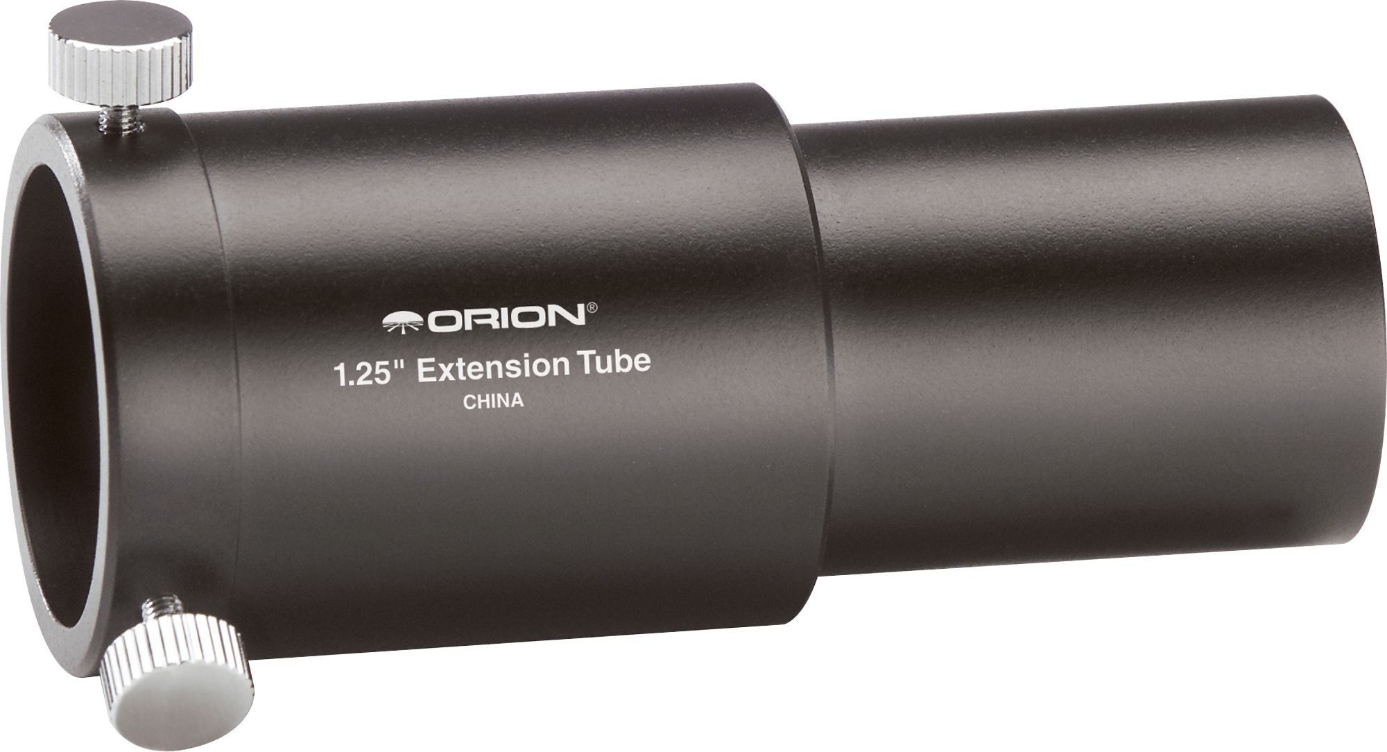 Obrázek: Detailní záběr view of the Orion 1.25-inch Extension Tube, highlighting the thumbscrews for securing accessories and the threaded barrel for filters.