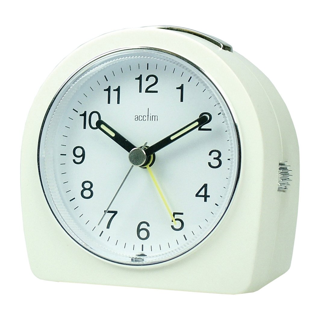 Image: The Acctim Freja 13532 alarm clock in white, showcasing its classic design with a round clock face and two adjustment knobs visible on the back.