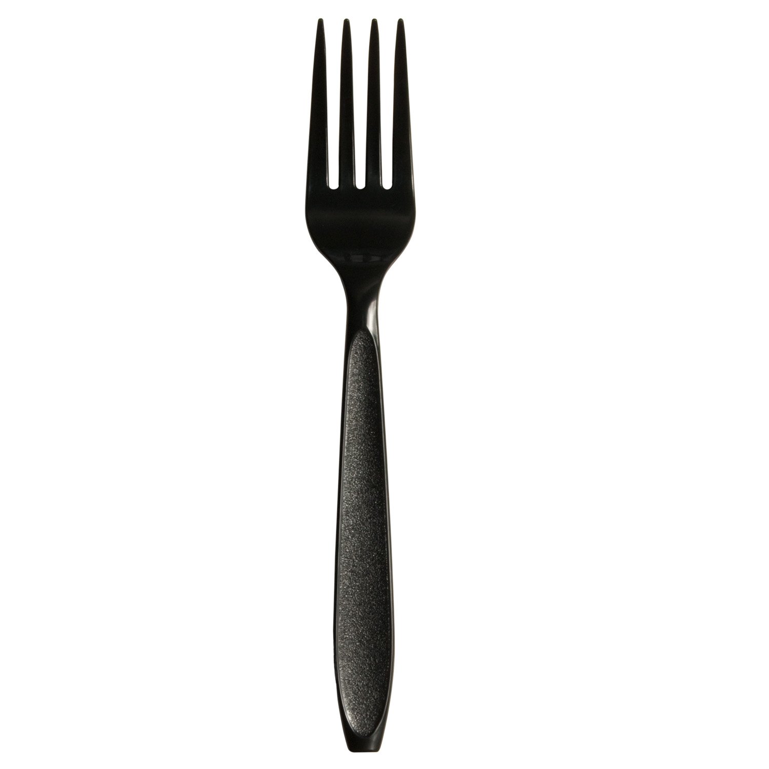 Figure 1: A single black disposable fork, designed for heavy-duty use, featuring a textured handle for improved grip.