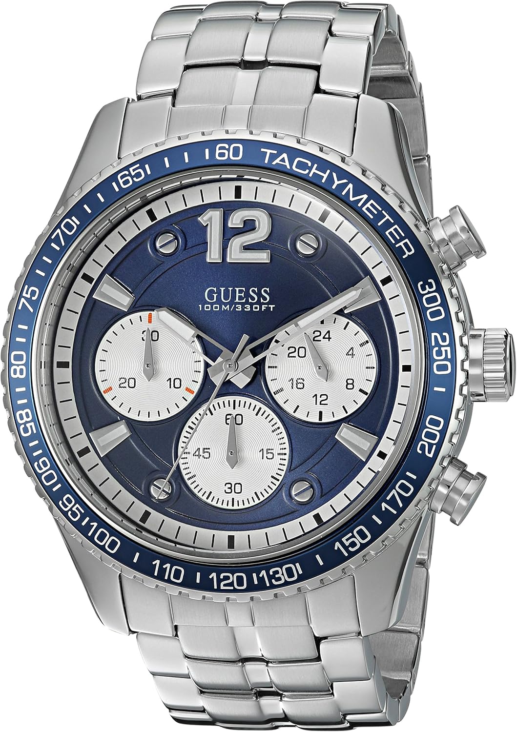 Vaše hodinky se vyznačují odolným pouzdrem z nerezové oceli, pohodlným náramkem z nerezové oceli s překlápěcím mechanismem a dvojitým tlačítkem pro uvolnění a kulatým ciferníkem s analogovým displejem se třemi ručičkami, který je poháněn přesným quartzovým strojkem. Číselník zahrnuje zlaté ručičky, hodinové indexy, tři funkční subciferníky a minutovou stopku, spolu s charakteristickými detaily GUESS. Hodinky se také mohou pochlubit funkcí chronografu a jsou vodotěsné do 50 metrů (165 stop).