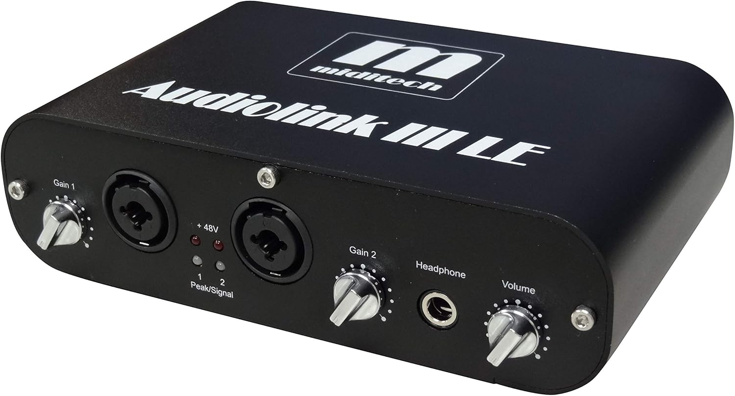 The Miditech Audiolink III is a versatile USB audio interface designed for recording and monitoring audio. It features two microphone preamps with phantom power, instrument/line inputs, and a class-compliant USB connection for easy setup across various operating systems. This device is USB bus powered, eliminating the need for an external power supply.