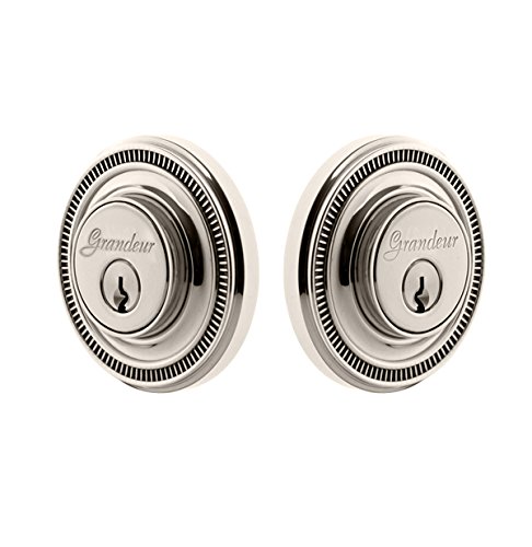 Image: Grandeur Double Cylinder Deadbolt in Polished Nickel, featuring the Soleil plate design. Two key cylinders are visible, indicating a double cylinder configuration.