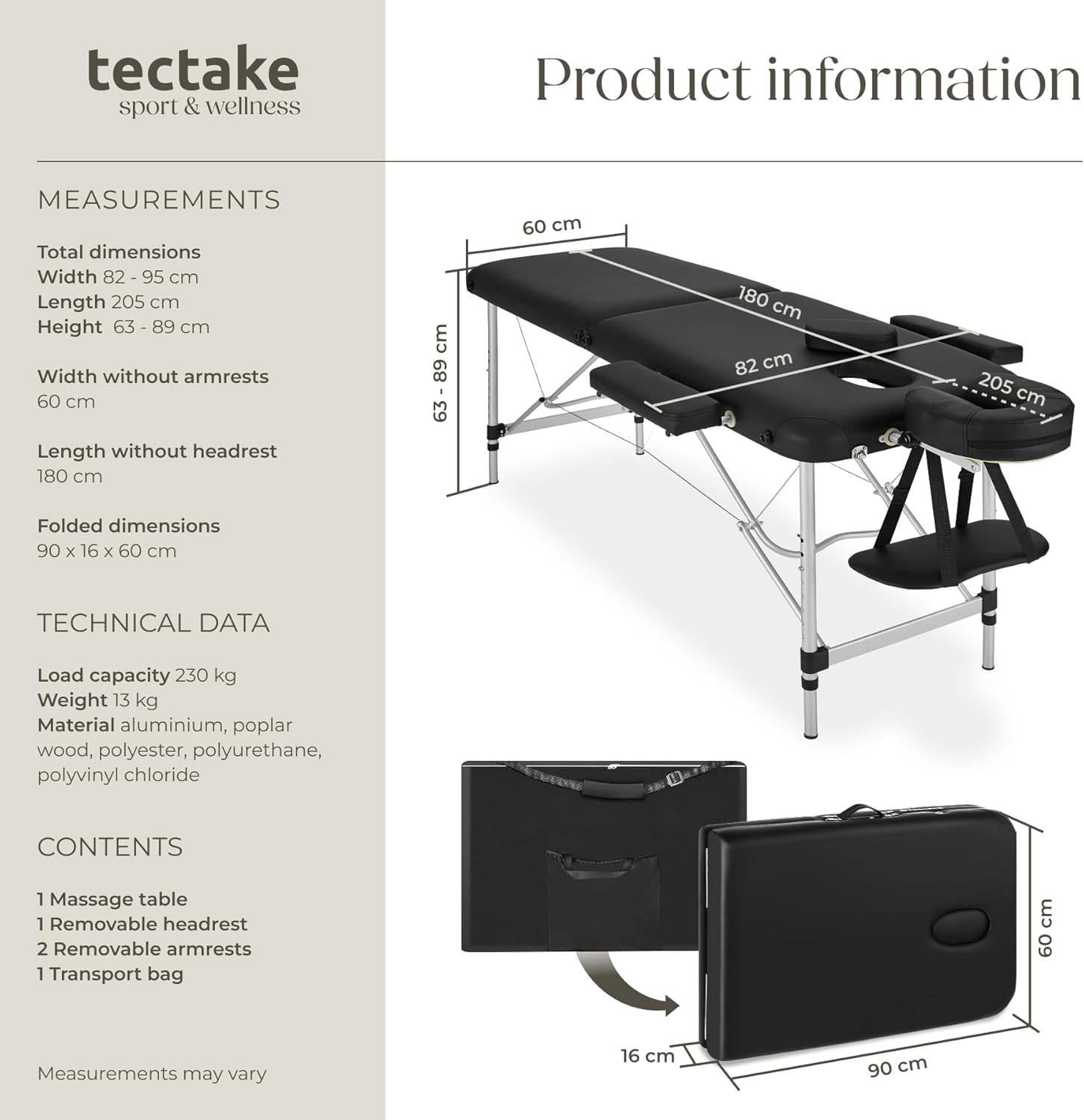 - The massage table is designed to hold a maximum load of approximately 230 kg (507 lbs). Do not exceed this weight limit.