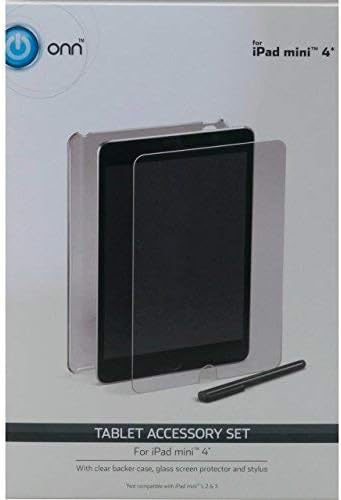 This image displays the retail packaging for the ONN Tablet Accessory Set. It features the clear backer case, the glass screen protector, and the touchscreen stylus, all designed for the iPad Mini 4.