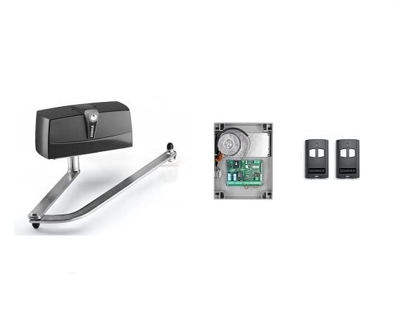 Obrázek: Overview of the Beninca K PR24 USA kit, showing the main actuator unit, the control board, and two remote controls.