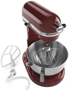 Popis obrázku: Tento obrázek zobrazuje kuchyňský robot KitchenAid Professional řady 5 Plus v lesklé skořicové (tmavě červená). Hlava mixéru je zakloněna dozadu, čímž je odhalen nástavec. Nerezová mísa je připevněna k základně a uvnitř mísy je viditelný šlehací nástavec. Nalevo od mixéru jsou samostatně zobrazeny plochý šlehač a hnětací hák.
