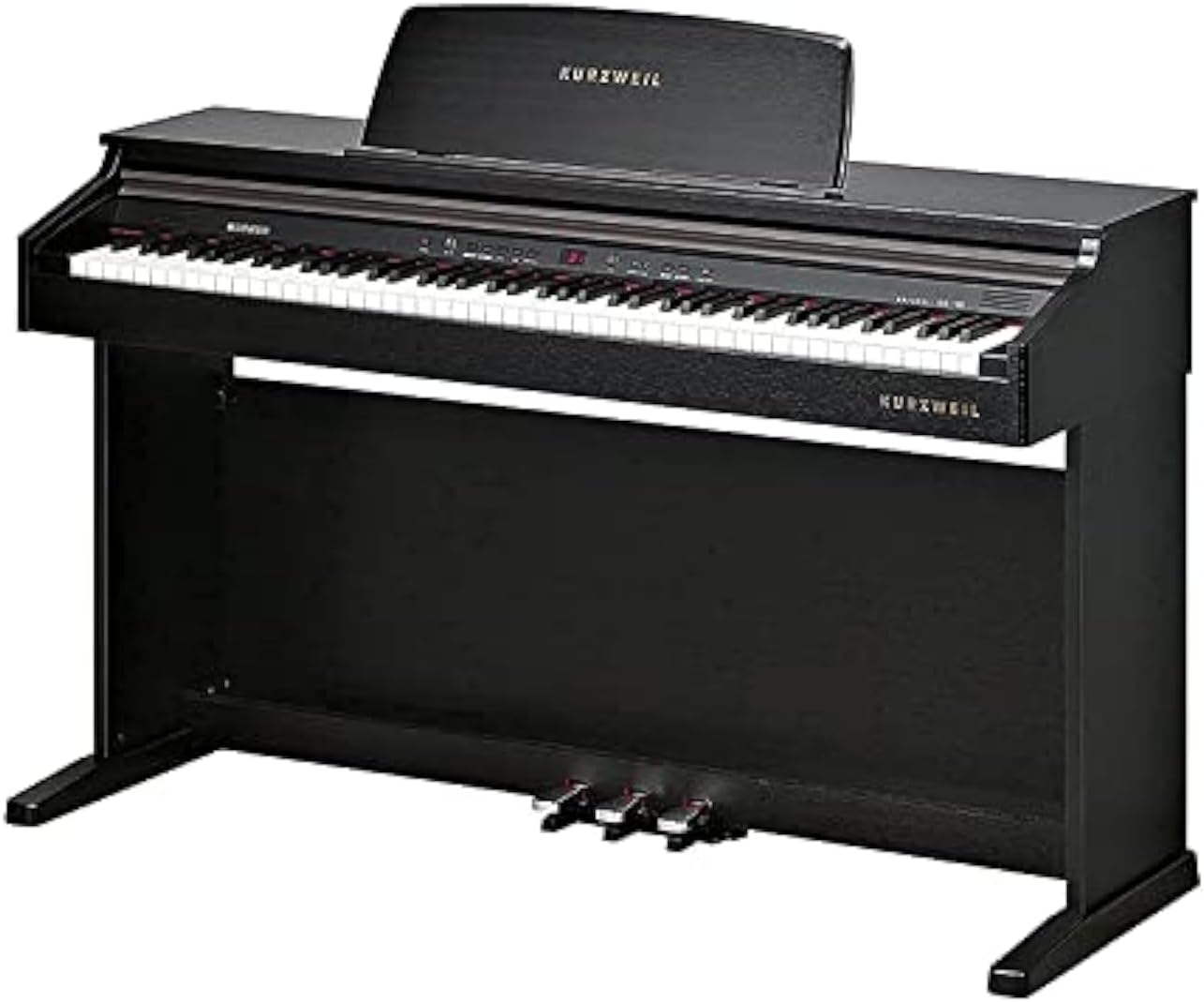 Obrázek 1: Digitální piano Kurzweil KA130. Tento obrázek zobrazuje celý nástroj, zvýrazněný jeho černým povrchem, 88klávesovou klaviaturou, integrovaným notovým stojanem a třemi pedály (sustain, sostenuto, soft) umístěnými na základně.