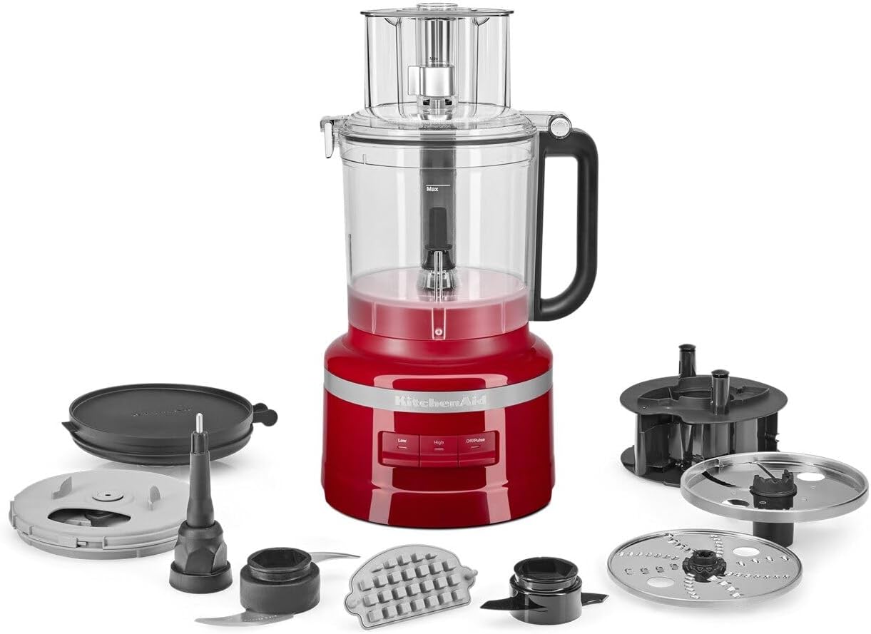 Image: The KitchenAid 13-Cup Food Processor in Empire Red, displayed with its various blades, discs, and the storage caddy.