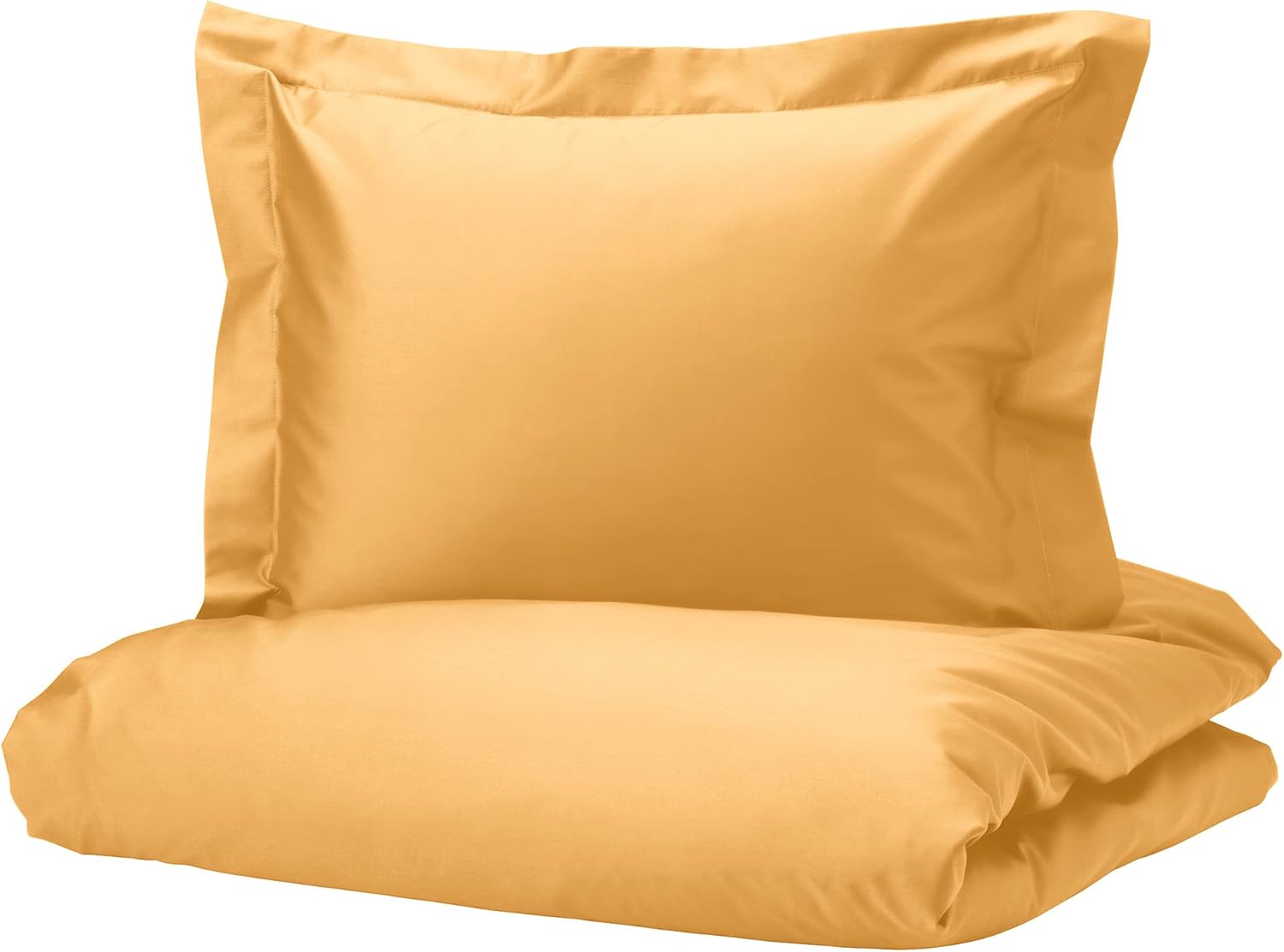 Image: The IKEA LUKTJASMIN duvet cover and a single pillowcase, presented folded. The fabric is a smooth, golden-yellow satin.