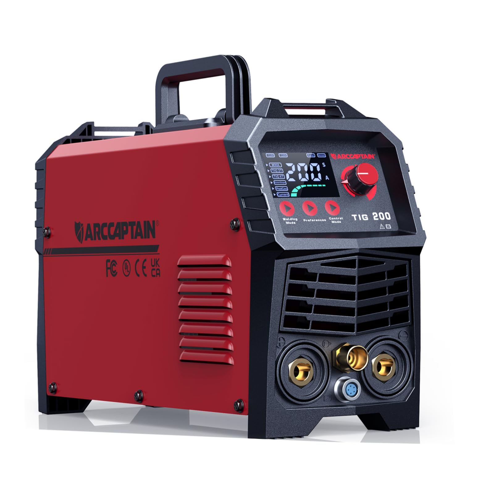 The ARCCAPTAIN TIG205A features a large LED display for easy parameter adjustment and monitoring.