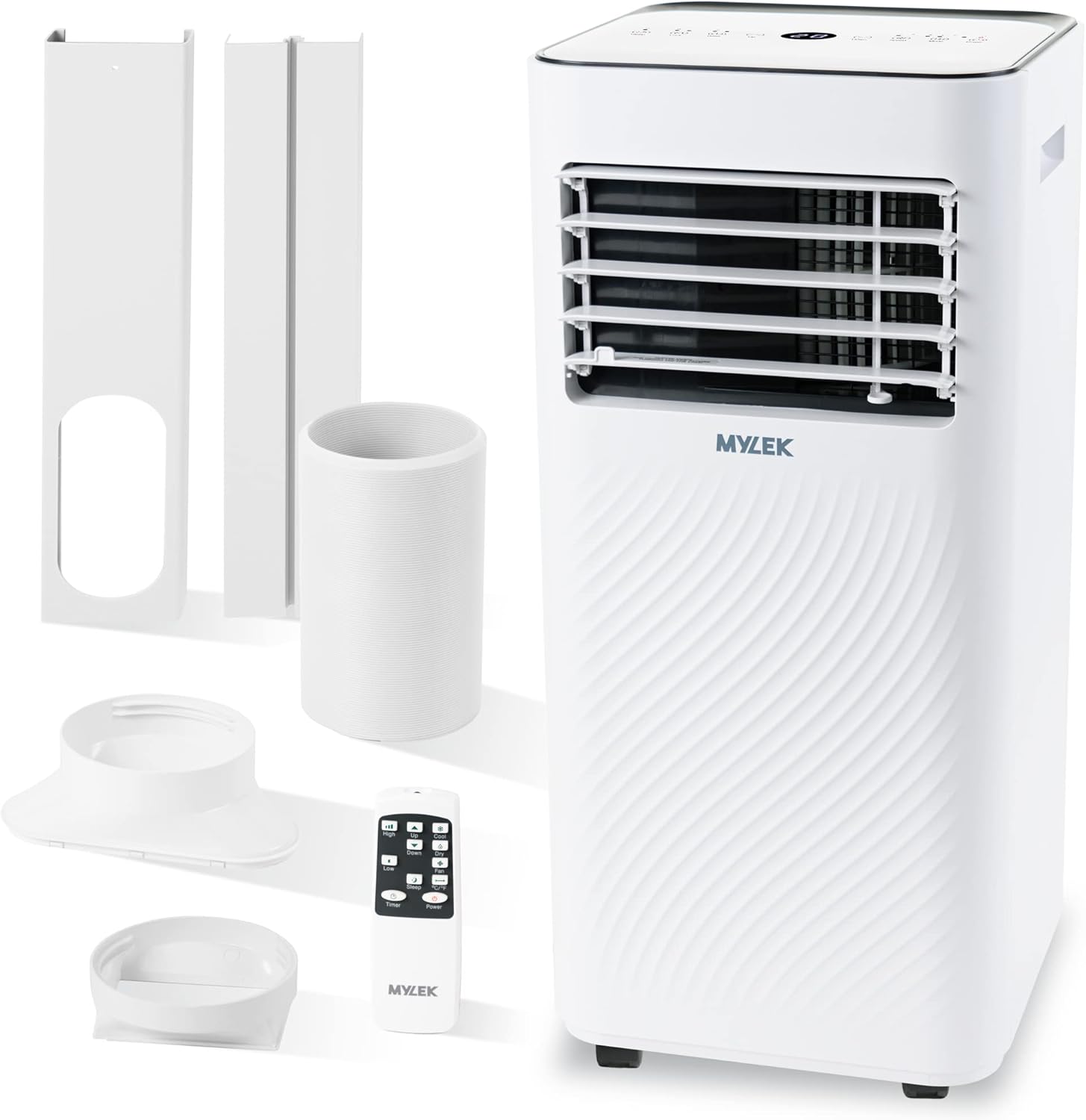 Image: The Mylek Air Conditioning Unit shown alongside its top-mounted digital control panel and the included remote control, highlighting user interface options.