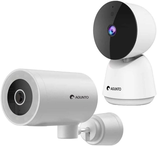 Image: The Agunto AGU-OC1 outdoor camera (left) and AGU-IC1 indoor camera (right), forming the complete security camera set.