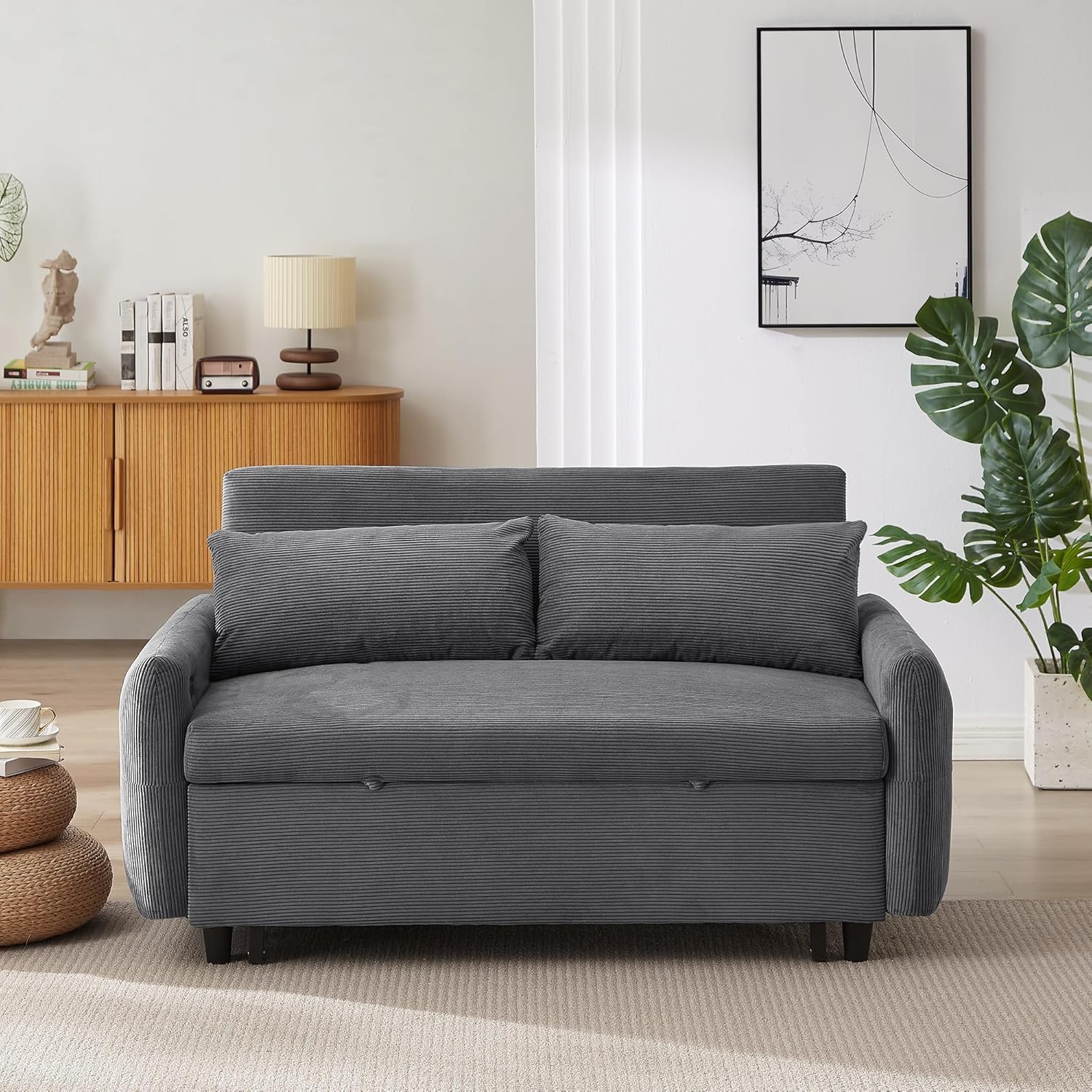 The Merax 57.28 inch Pull-Out Sofa Bed, dark grey, positioned in a modern living room, showcasing its compact design as a loveseat.