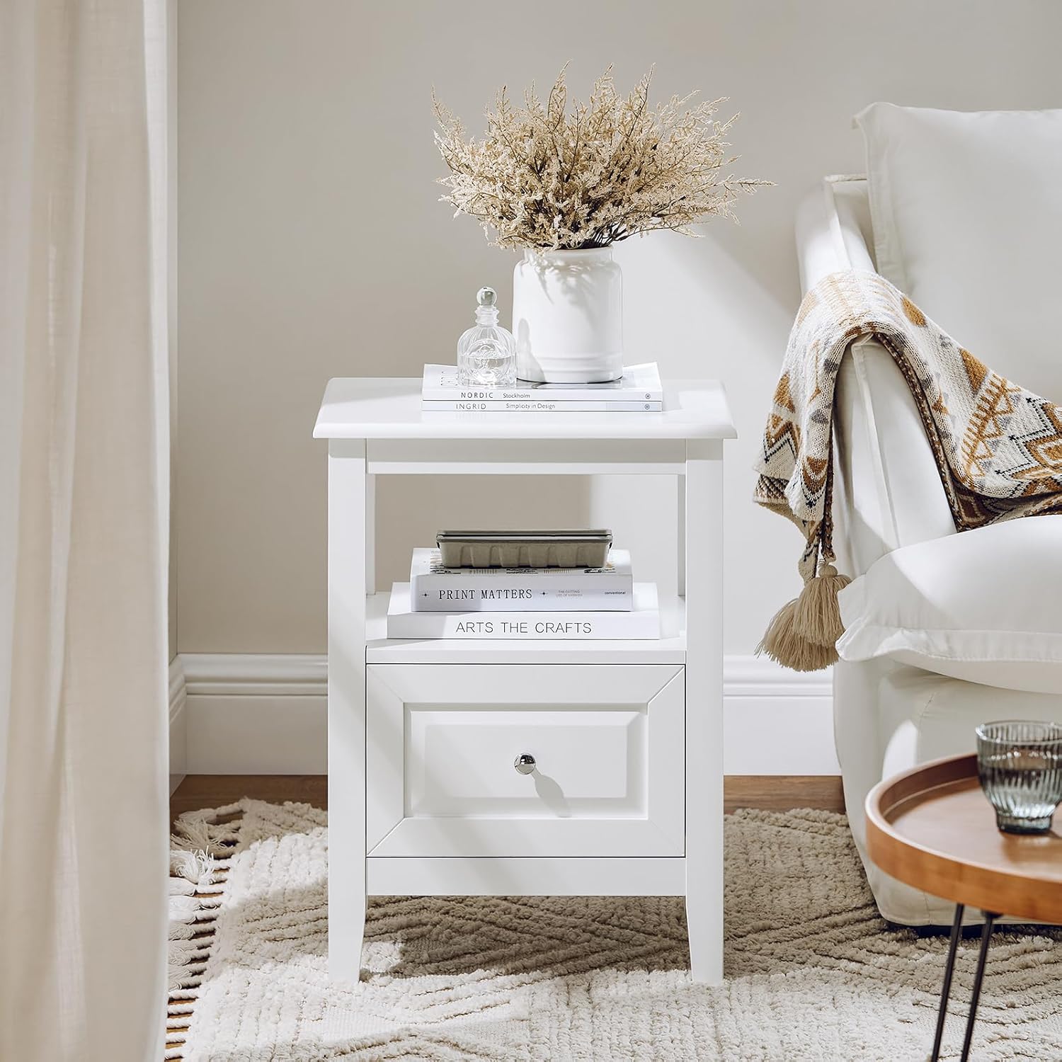 The SoBuy FBT131-W is a versatile bedside table designed for various uses in your home. It features a clean white finish, a top surface, an open shelf, and a drawer, providing storage and display space. Its compact design makes it suitable for smaller rooms.