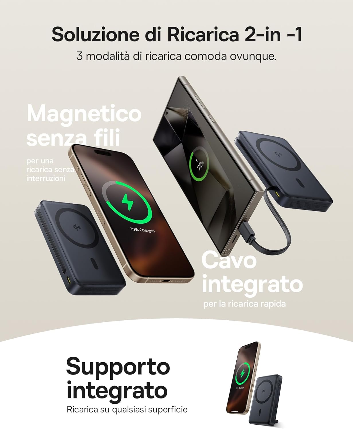 - Attach your Magsafe-compatible iPhone to the power bank magnetically for wireless charging, or connect any device via cable, and position it for optimal viewIng.