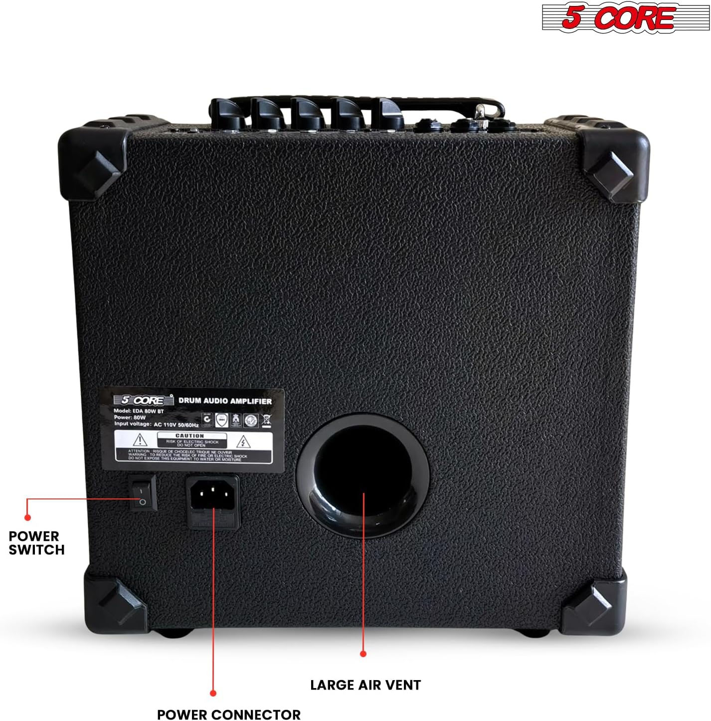 The 5 Core EDA 80W Electric Drum Amplifier is a high-output sound solution designed for electronic drums, keyboards, and other musical instruments. It features an 8-inch speaker and 80 watts of power, providing clear and robust sound for various performance and practice settings. Its compact design and multiple connectivity options make it a versatile tool for musicians.