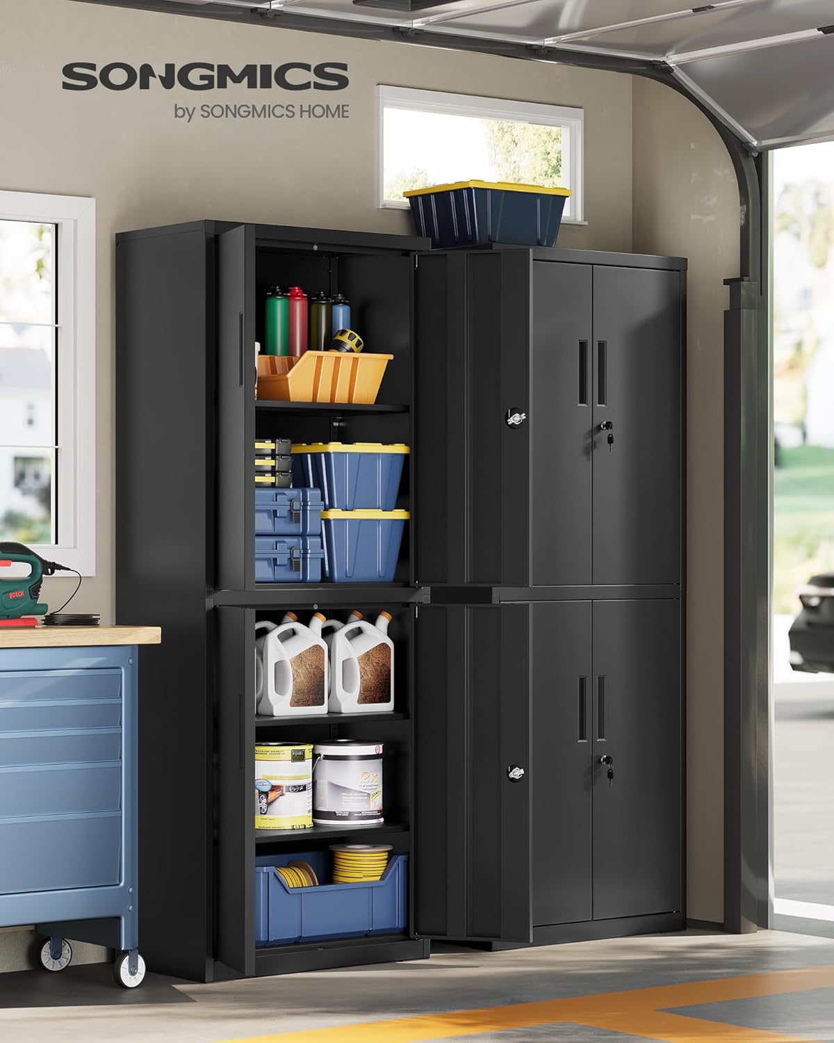 Thank you for choosing the SONGMICS OMC017BD01 Filing Cabinet. This steel storage cabinet is designed to provide a spacious and organized solution for your storage needs in various environments, including offices, garages, laundry rooms, and kitchens. Featuring four doors, five tiers, adjustable shelves, and a secure locking mechanism, this cabinet offers both functionality and durability. Please read this manual carefully before assembly and use to ensure proper installation and safe operation.