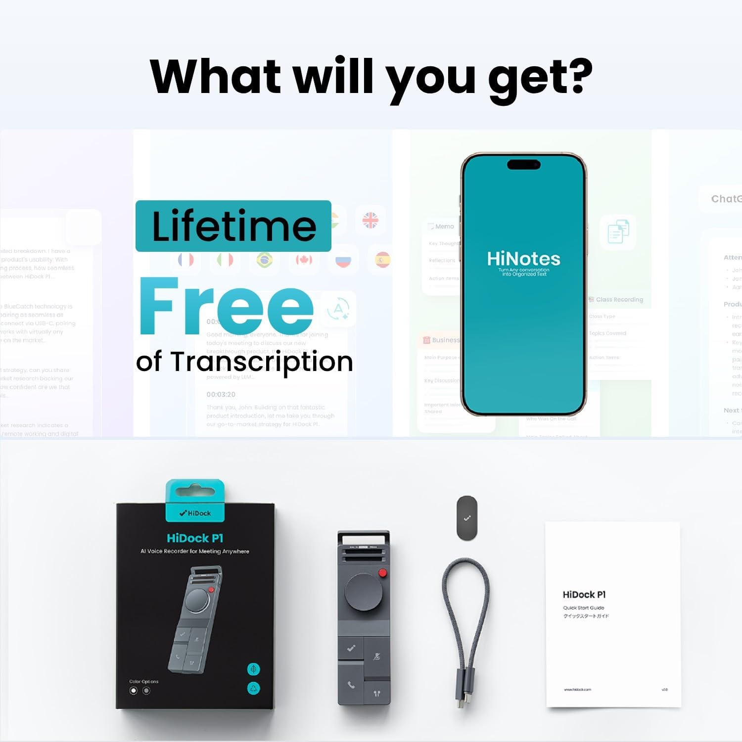 The companion HiNotes App serves as your command center for recordings. It provides high-precision transcription in 75 languages using top-tier AI models (including GPT-5, GPT-4, Gemini 3.0 Pro, Claude 4.1). The app can automatically generate meeting minutes, action lists, or custom summaries from multiple templates. Recordings are stored locally first, and transcriptions use secure API calls without training on your data. All data is encrypted end-to-end and stored on Microsoft Azure's SOC & ISO 27001 certified platform.